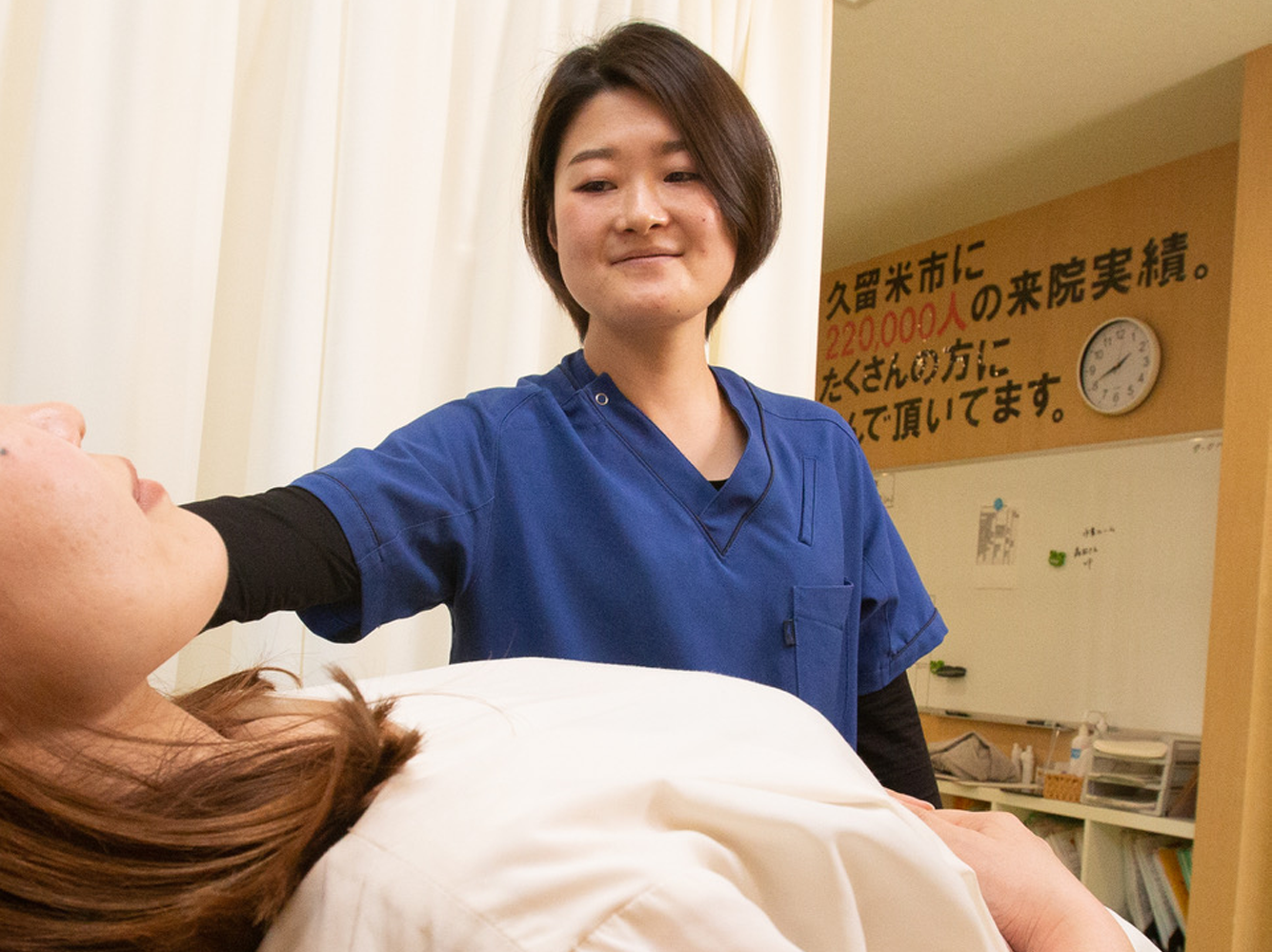 患者様とのコミュニケーションを1番に、あなたの悩みや不調に全力で向き合ってくれる整骨院を目指してこれまで22万人の来院実績を誇ります。『久留米の皆様を一人でも多く健康に!』をモットーに当院は「気軽に来院でき受診できる環境」「一人でも多く方を救う施術」「地域の人とのつながりを持つ地域社会への貢献」を掲げ、常に全力施術をしております。