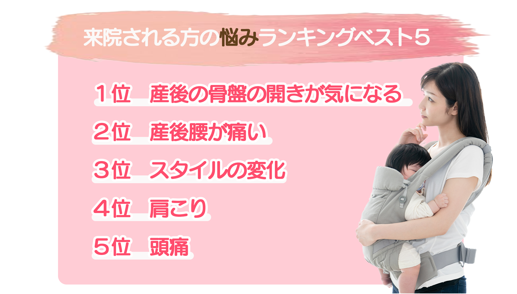 産後の骨盤矯正、骨盤矯正、猫背矯正という骨格のメンテナンスに特化しております。 肩こり、腰痛、冷え性、頭痛、シビレ、ダイエットなど、お身体の症状ぜひご相談ください。